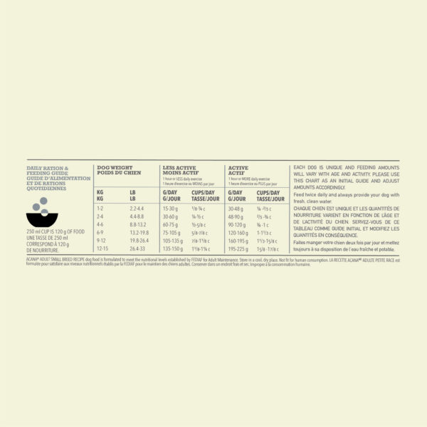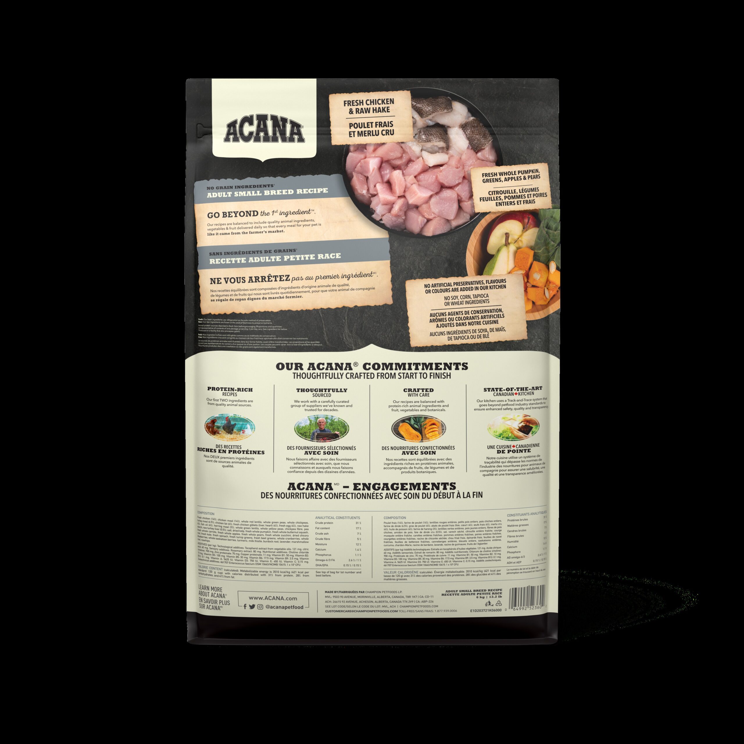 When it comes to ACANA™ food for dogs, we’re obsessed with every ingredient that goes into our premium recipes made right here in Canada. That’s why our Adult Small Breed Recipe is thoughtfully crafted to nurture your small breed dog with plenty of animal protein to meet their energy needs. Made with 60%** quality animal ingredients like fresh free-run* chicken and raw hake balanced with 40% fruit and vegetables*** like fresh whole pumpkin, greens, apples and pears, this recipe provides the nutrition and animal protein your small breed dog needs to live their best life. These wholesome ingredients are provided by suppliers we know and trust, and our vets and pet nutrition experts carefully craft each recipe with the goal of making your pet feel so good inside, you’ll see it on the outside. *Our free-run chickens and turkeys are not housed in cages and are able to move in a barn without outdoor access. **Approximate and derived from the unprocessed state of the ingredients. ***We also add essential vitamins and minerals, natural preservatives and probiotics. ****Produced in a facility that also processes grains. Our included fresh ingredients use refrigeration as the sole method of preservation and our included raw ingredients are frozen at their peak freshness.
