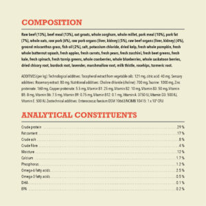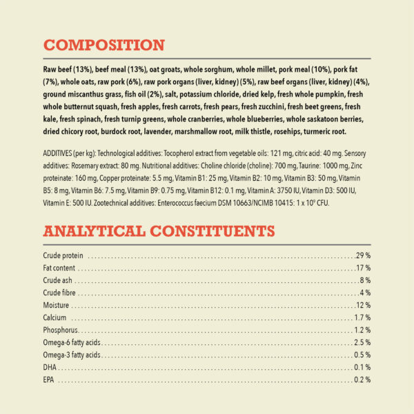 Raw beef (13%), beef meal (13%), oat groats, whole sorghum, whole millet, pork meal (10%), pork fat (7%), whole oats, raw pork (6%), raw pork organs (liver, kidney) (5%), raw beef organs (liver, kidney) (4%), ground miscanthus grass, fish oil (2%), salt, potassium chloride, dried kelp, fresh whole pumpkin, fresh whole butternut squash, fresh apples, fresh carrots, fresh pears, fresh zucchini, fresh beet greens, fresh kale, fresh spinach, fresh turnip greens, whole cranberries, whole blueberries, whole saskatoon berries, dried chicory root, burdock root, lavender, marshmallow root, milk thistle, rosehips, turmeric root. ADDITIVES (per kg): Technological additives: Tocopherol extract from vegetable oils: 121 mg, citric acid: 40 mg. Sensory additives: Rosemary extract: 80 mg. Nutritional additives: Choline chloride (choline): 700 mg, Taurine: 1000 mg, Zinc proteinate: 160 mg, Copper proteinate: 5.5 mg, Vitamin B1: 25 mg, Vitamin B2: 10 mg, Vitamin B3: 50 mg, Vitamin B5: 8 mg, Vitamin B6: 7.5 mg, Vitamin B9: 0.75 mg, Vitamin B12: 0.1 mg, Vitamin A: 3750 IU, Vitamin D3: 500 IU, Vitamin E: 500 IU. Zootechnical additives: Enterococcus faecium DSM 10663/NCIMB 10415: 1 x 109 CFU. Crude protein 29% Fat content 17% Crude ash 8% Crude fibre 4% Moisture 12% Calcium 1.7% Phosphorus 1.2% Omega-6 fatty acids* 2.5% Omega-3 fatty acids* 0.5% DHA (docosahexaenoic acid) 0.1% EPA (eicosapentaenoic acid) 0.2%