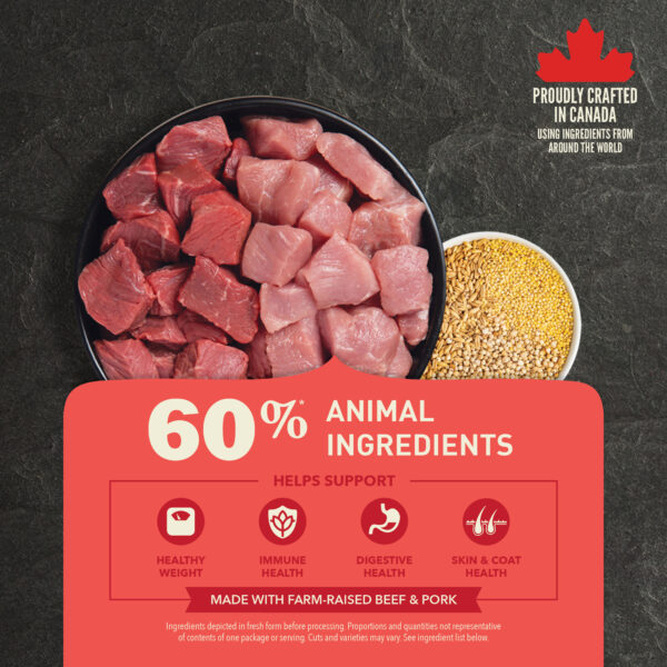 Get obsessed with protein-rich animal ingredients and fiber-rich wholesome grains in ACANA™ Healthy Grains! Our ACANA™ Healthy Grains Red Meat Recipe is specially crafted with fresh or raw farm-raised beef and savoury pork. It’s also balanced with healthy grains in the form of oats, sorghum and millet. These grains are high in fiber and gluten-free, offering added nutrition that helps support a healthy digestive environment. Our Red Meat Recipe is crafted with 60% animal ingredients* balanced with 40% wholesome grains, vegetables, fruit, botanicals and nutrients** and helps support 4 key health benefits. This results in a protein-rich, nutritious and delicious food to help them live a full, happy life. *Approximate and derived from the unprocessed state of the ingredients. **We also add essential vitamins and minerals, natural preservatives and probiotics.