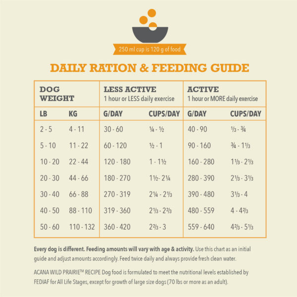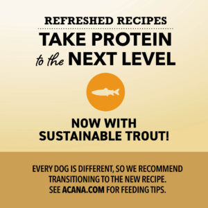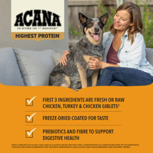 When it comes to ACANA™ recipes, we’re obsessed with choosing ingredients that are nutritious, delicious and protein-rich. Our Highest Protein Dog Food is perfect for satisfying your dog with even more of the animal protein they crave. Our Wild Prairie recipe is crafted with 70% quality animal ingredients* like free-run** chicken and turkey, wild-caught and sustainably farmed fish balanced with 30%*** fruit and vegetables to help nurture your dog with flavour and animal protein. It also includes prebiotics and fibre to help support your dog’s digestive health. And with no artificial colours, flavours or preservatives added in our kitchen, it’s a recipe you and your dog will both love. Nurture your dog with protein-rich, nutritious, and delicious dog food to help them live a healthy, happy life. *Approximate and derived from the unprocessed state of the ingredients. **Our free-run chickens and turkeys are not housed in cages and are able to move in a barn without outdoor access. ***We also add vitamins, minerals, natural preservatives and probiotics. ****Produced in a facility that also processes grains. Our included fresh ingredients use refrigeration as the sole method of preservation and our included raw ingredients are frozen at their peak freshness.