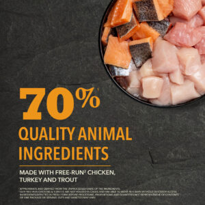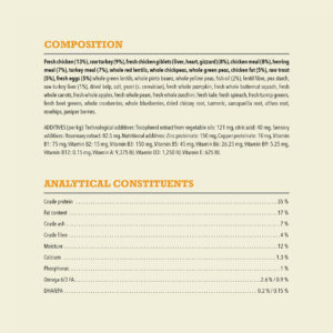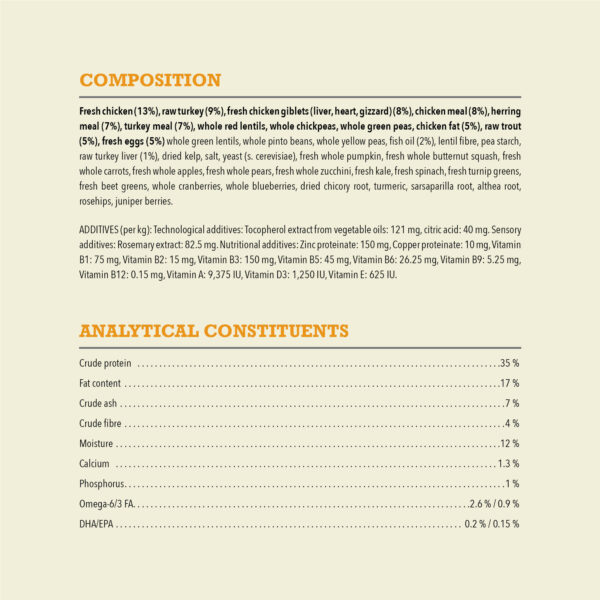 COMPOSITION: Fresh chicken (13%), raw turkey (9%), fresh chicken giblets (liver, heart, gizzard) (8%), chicken meal (8%), herring meal (7%), turkey meal (7%), whole red lentils, whole chickpeas, whole green peas, chicken fat (5%), raw trout (5%), fresh eggs (5%) whole green lentils, whole pinto beans, whole yellow peas, fish oil (2%), lentil fibre, pea starch, raw turkey liver (1%), dried kelp, salt, yeast (s. cerevisiae), fresh whole pumpkin, fresh whole butternut squash, fresh whole carrots, fresh whole apples, fresh whole pears, fresh whole zucchini, fresh kale, fresh spinach, fresh turnip greens, fresh beet greens, whole cranberries, whole blueberries, dried chicory root, turmeric, sarsaparilla root, althea root, rosehips, juniper berries ADDITIVES (per kg): Technological additives: Tocopherol extract from vegetable oils: 121 mg, citric acid: 40 mg. Sensory additives: Rosemary extract: 82.5 mg. Nutritional additives: Zinc proteinate: 150 mg, Copper proteinate: 10 mg, Vitamin B1: 75 mg, Vitamin B2: 15 mg, Vitamin B3: 150 mg, Vitamin B5: 45 mg, Vitamin B6: 26.25 mg, Vitamin B9: 5.25 mg, Vitamin B12: 0.15 mg, Vitamin A: 9,375 IU, Vitamin D3: 1,250 IU, Vitamin E: 625 IU. Crude protein 35 % Fat content 17 % Crude ash 7 % Crude fibre 4 % Moisture 12 % Calcium 1.3 % Phosphorus 1 % Omega-6 Fatty Acids 2.6 % Omega-3 Fatty Acids 0.9 % DHA/EPA 0.2 %/0.15 %