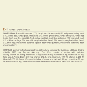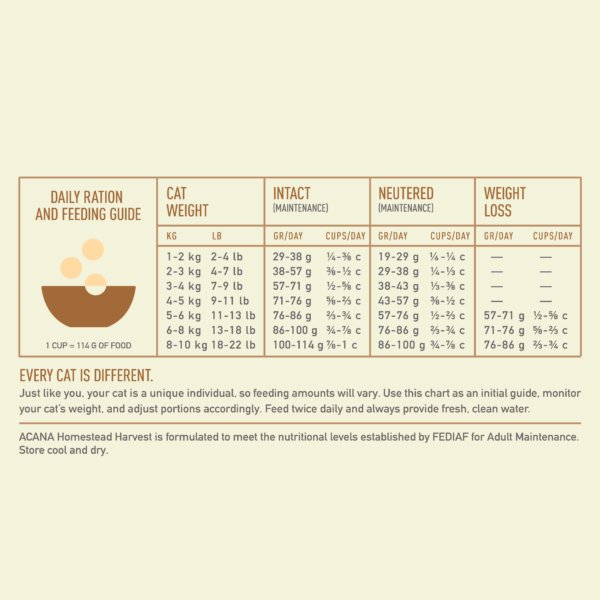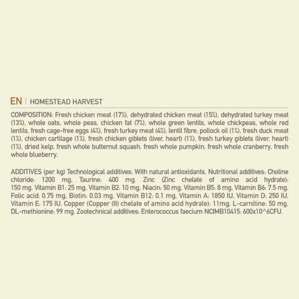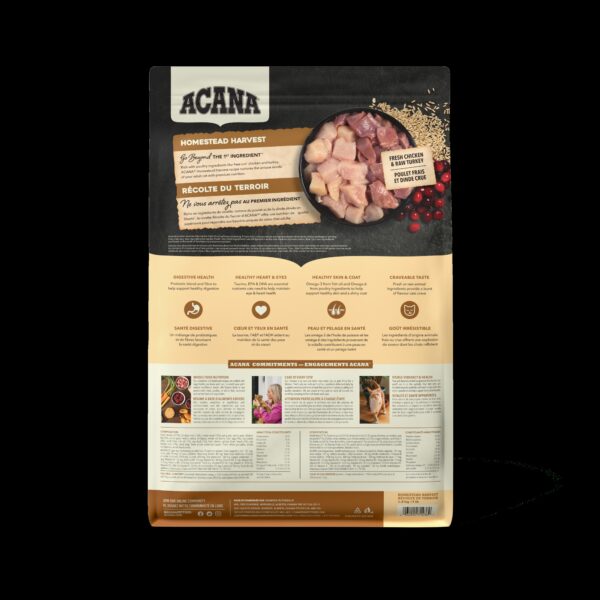 Our ACANA™ Homestead Harvest Recipe satisfies your cat with plenty of protein-rich poultry. Rich with 65% quality animal ingredients* including free-run** chicken and turkey, Homestead Harvest is crafted with the animal protein your cat needs to be their best. This nutrient-dense recipe also helps support key health benefits for your cat, including shiny coat & healthy skin, strong muscle & bone maintenance, and healthy digestion & immune system. Nurture your feline with a poultry-rich recipe tailored to keep them healthy and happy with ACANA Homestead Harvest! *Approximate and derived from the unprocessed state of the ingredients. **Our free-run chickens and turkeys are not housed in cages and are able to move in a barn without outdoor access. Our raw ingredients are frozen at their peak freshness.