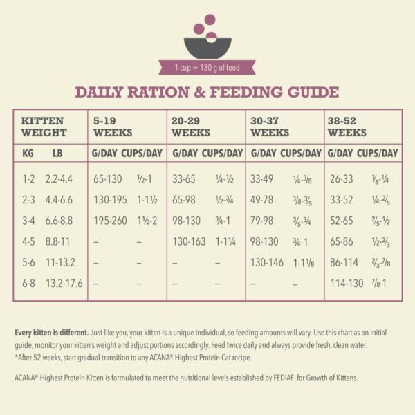 Nurture your growing kitten with more animal protein in ACANA™ Highest Protein Kitten recipe. Perfect for kittens up to 12 months old, this premium recipe is crafted with 75% protein-rich animal ingredients* including free-run** chicken, turkey, salmon, and no grain ingredients*** to satisfy and nourish your young feline. Our nutritious ingredients also help support the growth and development of your kitten, including healthy skin & coat, healthy heart & eyes and digestive health. See your kitten grow up healthy and strong with protein-rich recipe crafted specially for their needs. *Approximate and derived from the unprocessed state of the ingredients. **Our free-run chickens and turkeys are not housed in cages and are able to move in a barn without outdoor access. ***Produced in a facility that also processes grains.