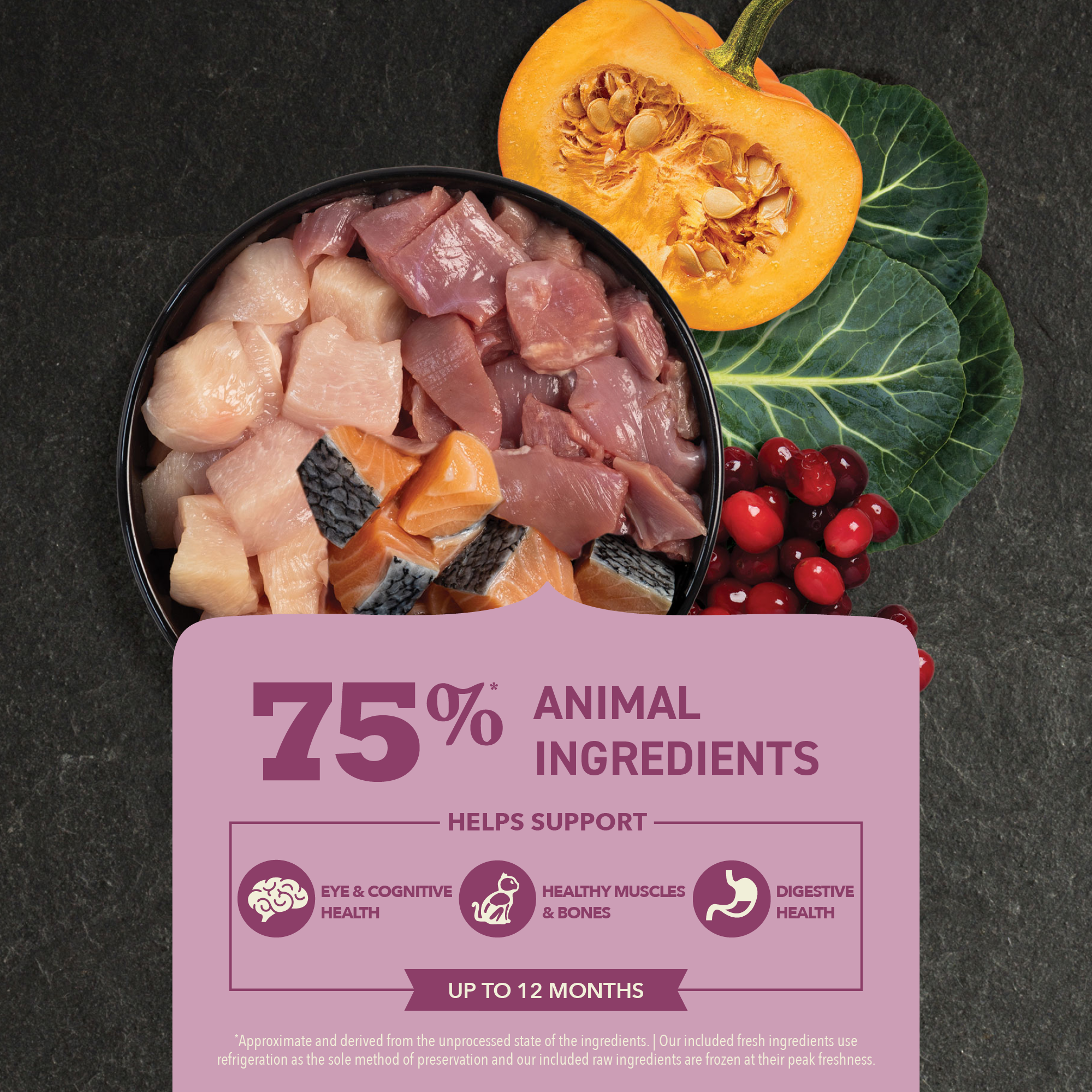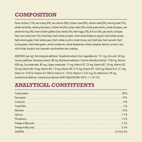 Fresh chicken (11%), raw turkey (8%), raw salmon (8%), chicken meal (8%), salmon meal (8%), herring meal (7%), whole red lentils, whole pinto beans, chicken fat (6%), turkey meal (5%), whole green lentils, whole chickpeas, raw whole herring (4%), fresh chicken giblets (liver, heart) (3%), fresh eggs (3%), fish oil (3%), pea starch, chickpea fibre, raw turkey liver (1%), dried kelp, fresh whole pumpkin, fresh whole butternut squash, fresh whole carrots, fresh whole apples, fresh whole pears, fresh whole zucchini, dried chicory root, fresh kale, fresh spinach, fresh turnip greens, fresh beet greens, whole cranberries, whole blueberries, whole saskatoon berries, turmeric root, milk thistle, burdock root, lavender, marshmallow root, rosehips ADDITIVES (per kg): Technological additives: Tocopherol extracts from vegetable oils: 121 mg, citric acid: 40 mg. Sensory additives: Rosemary extract: 80 mg. Nutritional additives: Choline chloride (choline): 1750 mg, Taurine: 400 mg, Zinc proteinate: 80 mg, Copper proteinate: 11 mg, Vitamin B1: 25 mg, Vitamin B2: 10 mg, Vitamin B3: 50 mg, Vitamin B5: 8 mg, Vitamin B6: 7.5 mg, Vitamin B9: 0.75 mg, Vitamin B7: 0.05 mg, Vitamin B12: 0.1 mg, Vitamin A: 3750 IU, Vitamin D3: 500 IU, Vitamin E: 170 IU, Vitamin C: 0.01 mg, DL-methionine: 99 mg. Zootechnical additives: Enterococcus faecium DSM 10663/NCIMB 10415: 1 x 109 CFU. Crude protein 38 % Fat content 9 % Crude ash 9 % Crude fibre 3 % Moisture 10 % Calcium 1.7 % Phosphorus 1.4 % Omega-6/3 FA 2.6 % / 1.3 % DHA/EPA 0.4 % / 0.4 %