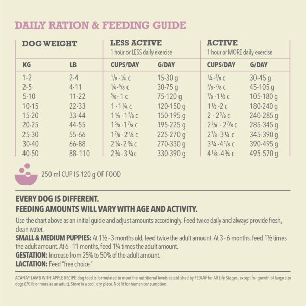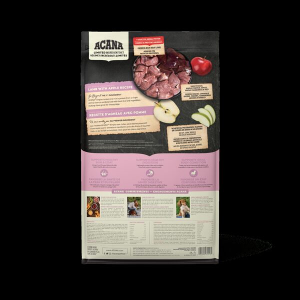 In premium ACANA™ recipes, every ingredient matters. That’s why our ACANA Singles Limited Ingredient Diet Recipes are thoughtfully crafted with protein from a single animal source*, making them perfect for picky pups or dogs with food sensitivities! Our Lamb & Apple Recipe includes 60% protein-rich lamb ingredients** balanced with 40% vegetables, fruit and nutrients*** like nutritious apples, and no grain ingredients****. It also includes no artificial preservatives, flavours or colours added in our kitchen. This recipe helps support 3 key health benefits for your dog, including healthy skin & coat, healthy digestion and ideal body condition. It helps your dog feel so good on the inside, you’ll see it on the outside! *Also contains fish oil. **Approximate and derived from the unprocessed state of the ingredients. ***We also add vitamins and minerals, natural preservatives, antioxidants and probiotics. ****Produced in a facility that also processes grains.
