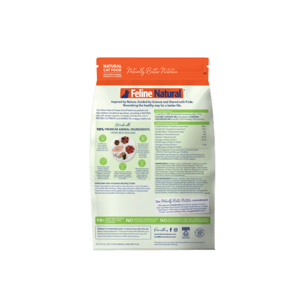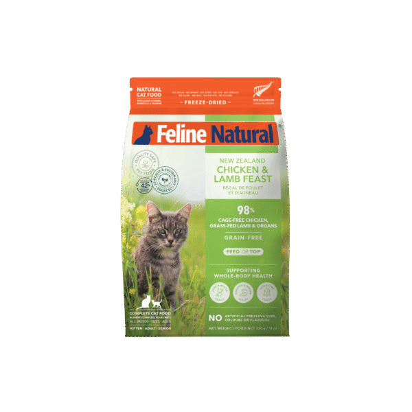Feline Natural Chicken and Lamb Feast Freeze-Dried Cat Food is a complete and balanced meal formulated for all life stages. It can be fed as it is, or as a nutrient-dense meal topper over regular kibble. This formula is freeze-dried to lock in flavour, aroma, and nutritional value. Made in New Zealand and without wheat, gluten, GMO ingredients, corn, soy, cereals, dairy, rice, potato, and all other fillers.