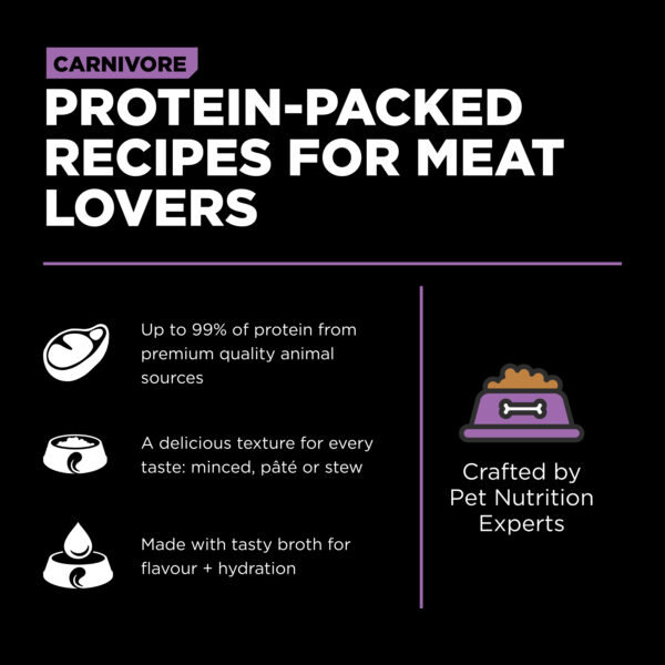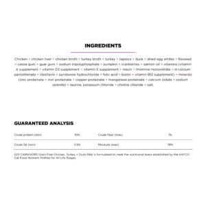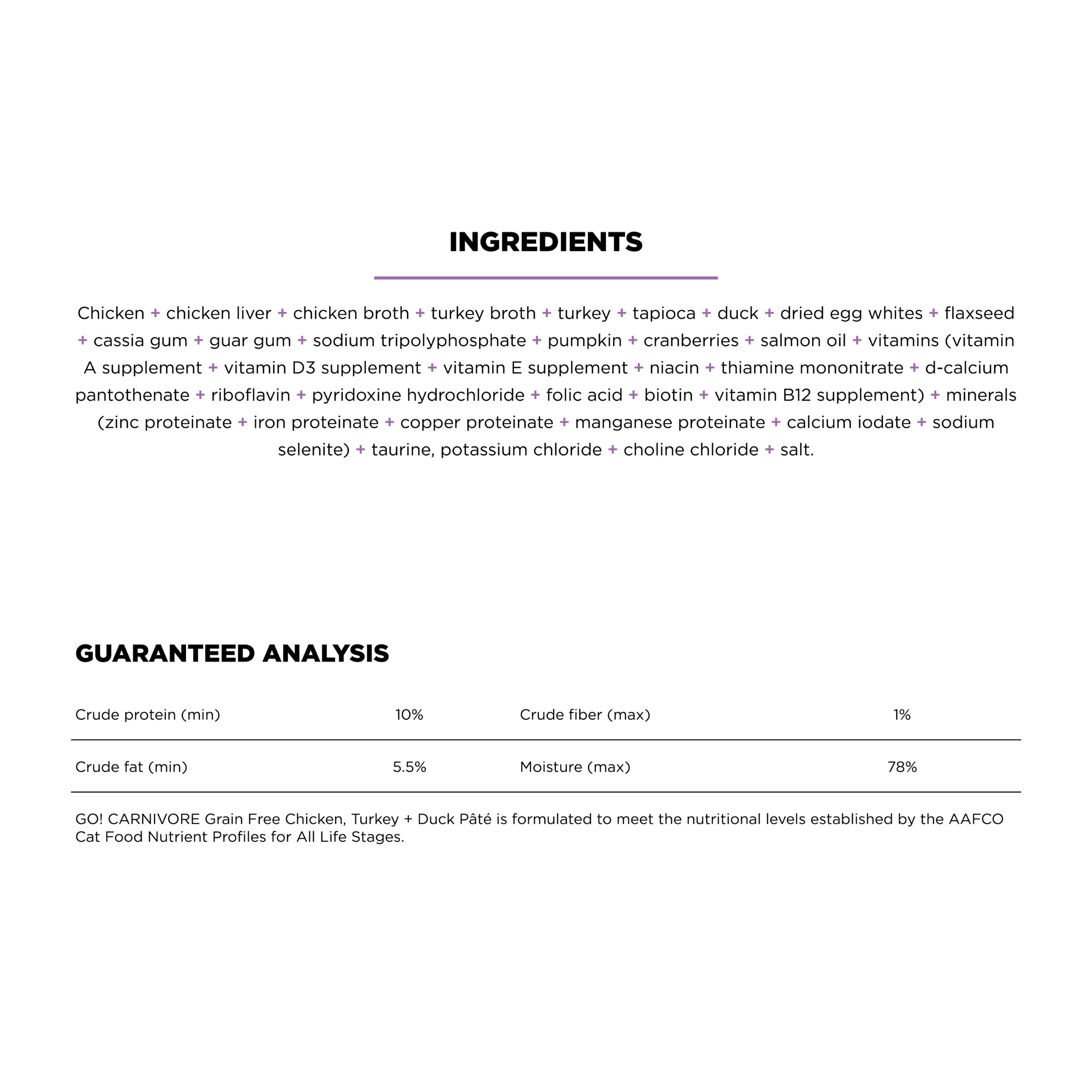 Go! Solutions Carnivore Grain Free Chicken, Turkey + Duck Pâté Recipe for cats is a protein-packed meal bursting with real meat to support their strong and lean muscles. Formulated in Ontario, Canada, this tasty wet cat food not only satisfies their taste buds but also provides complete and balanced nutrition for cats of all ages.