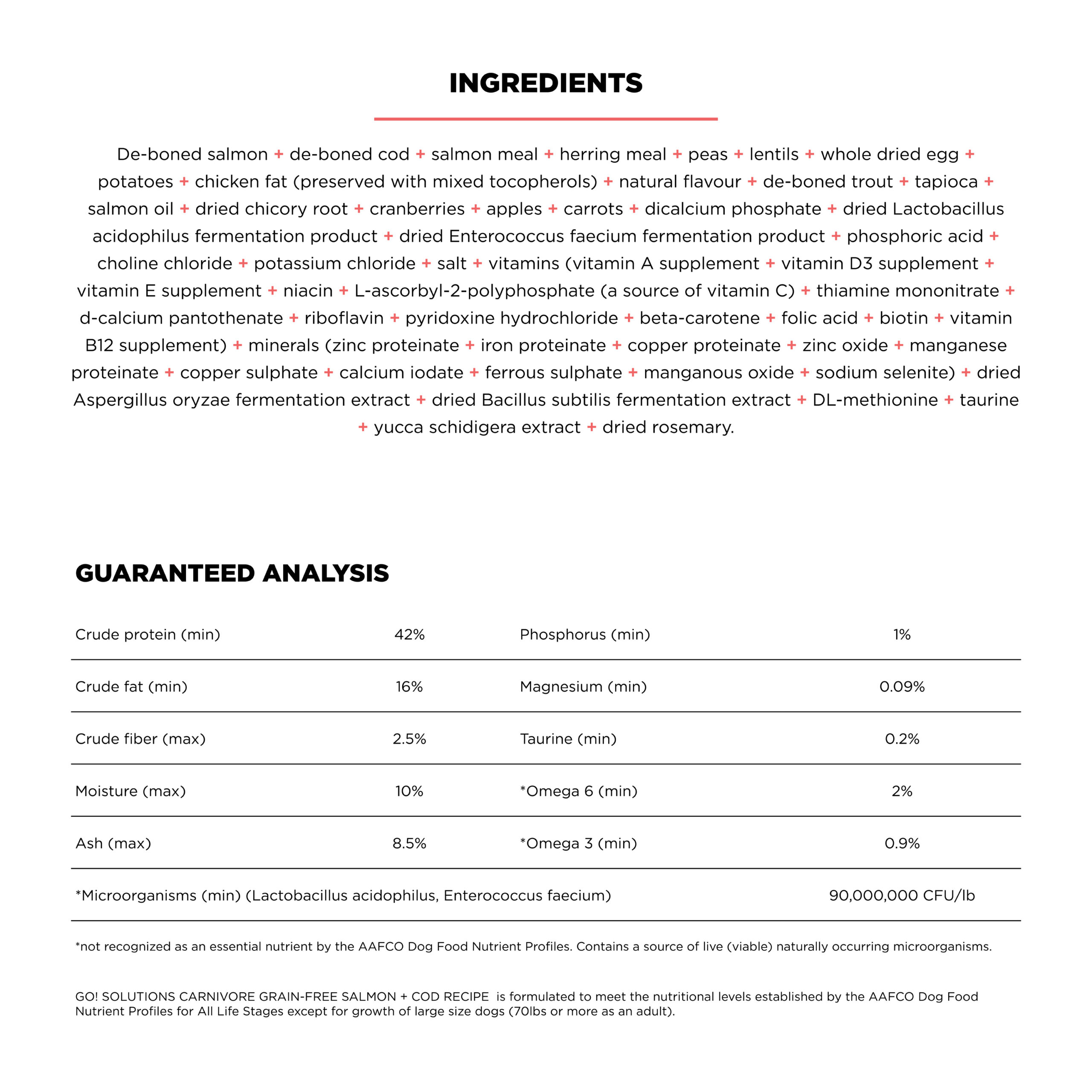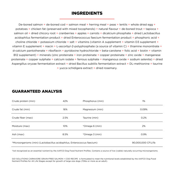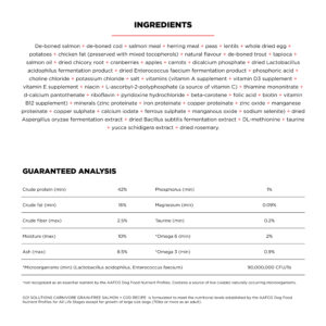 De-boned salmon, de-boned cod, salmon meal, herring meal, peas, lentils, whole dried egg, potatoes, chicken fat (preserved with mixed tocopherols), natural flavour, de-boned trout, tapioca, salmon oil, dried chicory root, cranberries, apples, carrots, dicalcium phosphate, dried Lactobacillus acidophilus fermentation product, dried Enterococcus faecium fermentation product, phosphoric acid, choline chloride, potassium chloride, salt, vitamins (vitamin E supplement, niacin, L-ascorbyl-2-polyphosphate (a source of vitamin C), thiamine mononitrate, biotin, vitamin A supplement, d-calcium pantothenate, beta-carotene, riboflavin, pyridoxine hydrochloride, vitamin B12 supplement, vitamin D3 supplement, folic acid), minerals (zinc proteinate, ferrous sulphate, zinc oxide, iron proteinate, copper sulphate, sodium selenite, copper proteinate, manganese proteinate, manganous oxide, calcium iodate), dried Aspergillus oryzae fermentation extract, dried Bacillus subtilis fermentation extract, DL-methionine, taurine, yucca schidigera extract, dried rosemary. Crude protein (min) 42% Crude fat (min) 16% Crude fibre (max) 2.5% Moisture (max) 10% Ash (max) 8.5% Phosphorus (min) 1% Magnesium (min) 0.09% Taurine (min) 0.2% *Omega-6 (min) 2% *Omega-3 (min) 0.9% *Microorganisms (min) 90,000,000 CFU/lb (Lactobacillus acidophilus, Enterococcus faecium) *not recognized as an essential nutrient by the AAFCO Cat Food Nutrient Profiles. Contains a source of live (viable) naturally occurring microorganisms.