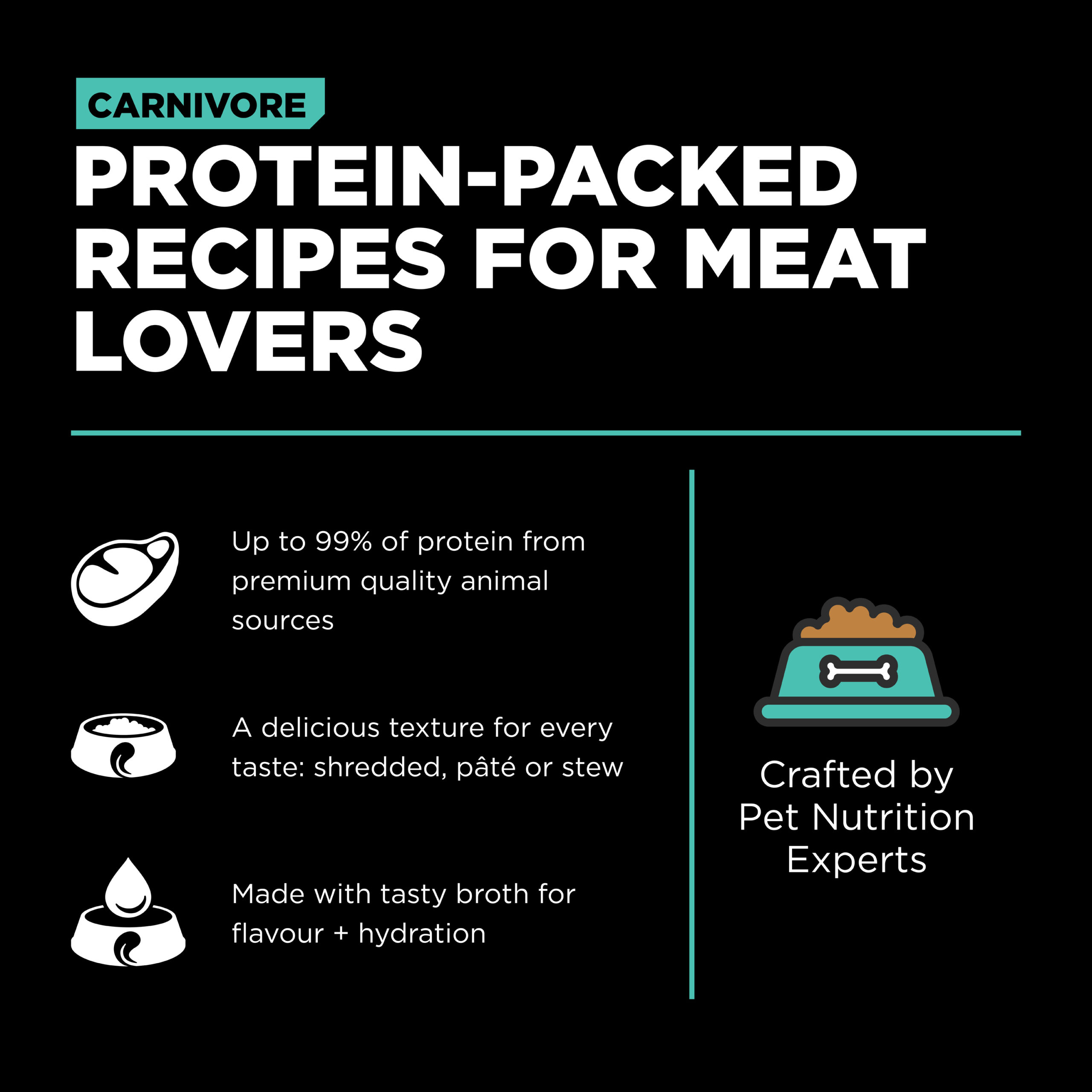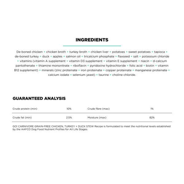 Go! Solutions Carnivore Grain Free Chicken, Turkey + Duck Stew for dogs is a protein-packed meal packed with premium meat proteins to support their strong and lean muscles. Formulated in Ontario, Canada, this tasty wet dog food not only satisfies their taste buds but also provides complete and balanced nutrition for dogs of all ages.