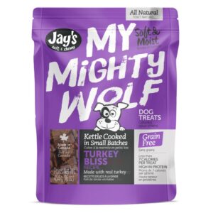Treat your furry friend to the ultimate snack with Jay’s My Mighty Wolf Turkey Bliss! Crafted with care in Canada, these soft and moist dog treats are kettle-cooked in small batches to ensure exceptional quality and flavor. Made with real turkey, this grain-free recipe is packed with high protein to fuel your dog’s active lifestyle while satisfying their taste buds.